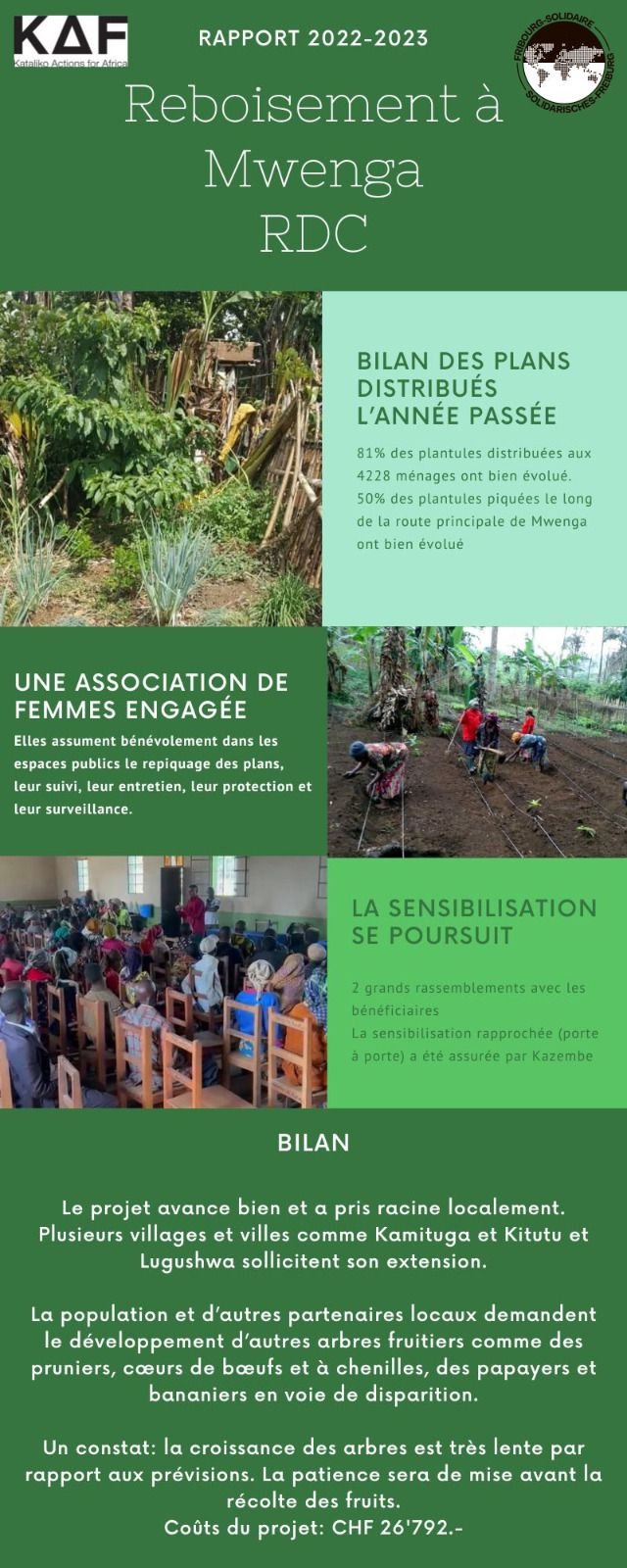 Grâce à ce projet de reboisement à Mwenga autour de la réserve naturelle d’Itombwe, KAF a planté des arbres fruitiers (orangers, papayer, avocatier, manguier, agrumes, pruniers et bananiers rares), arbres energétiques (acacias, terminalia superba, maesoplis, etc), en vue de protéger l’environnement, lutter contre la faim, la pauvreté et la mal nutrition. De 2021 jusqu’à présent, nous avons planté 20463 plantules qui ont profité à 7082 ménages. KAF a aussi planté 1031 arbres dans les espaces publics. Ce projet réussi devra étre répliqué dans d’autres villes.